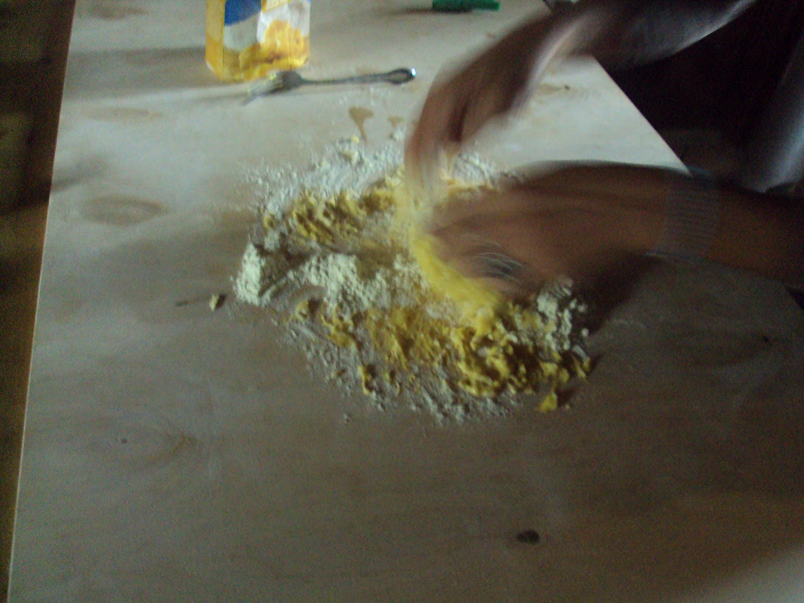 1. So. You take your flour and you make a big pile on your clean surface. Take your finger, and make a little bowl shape in the flour, without it touching the bottom. Kind of like a little vocano.