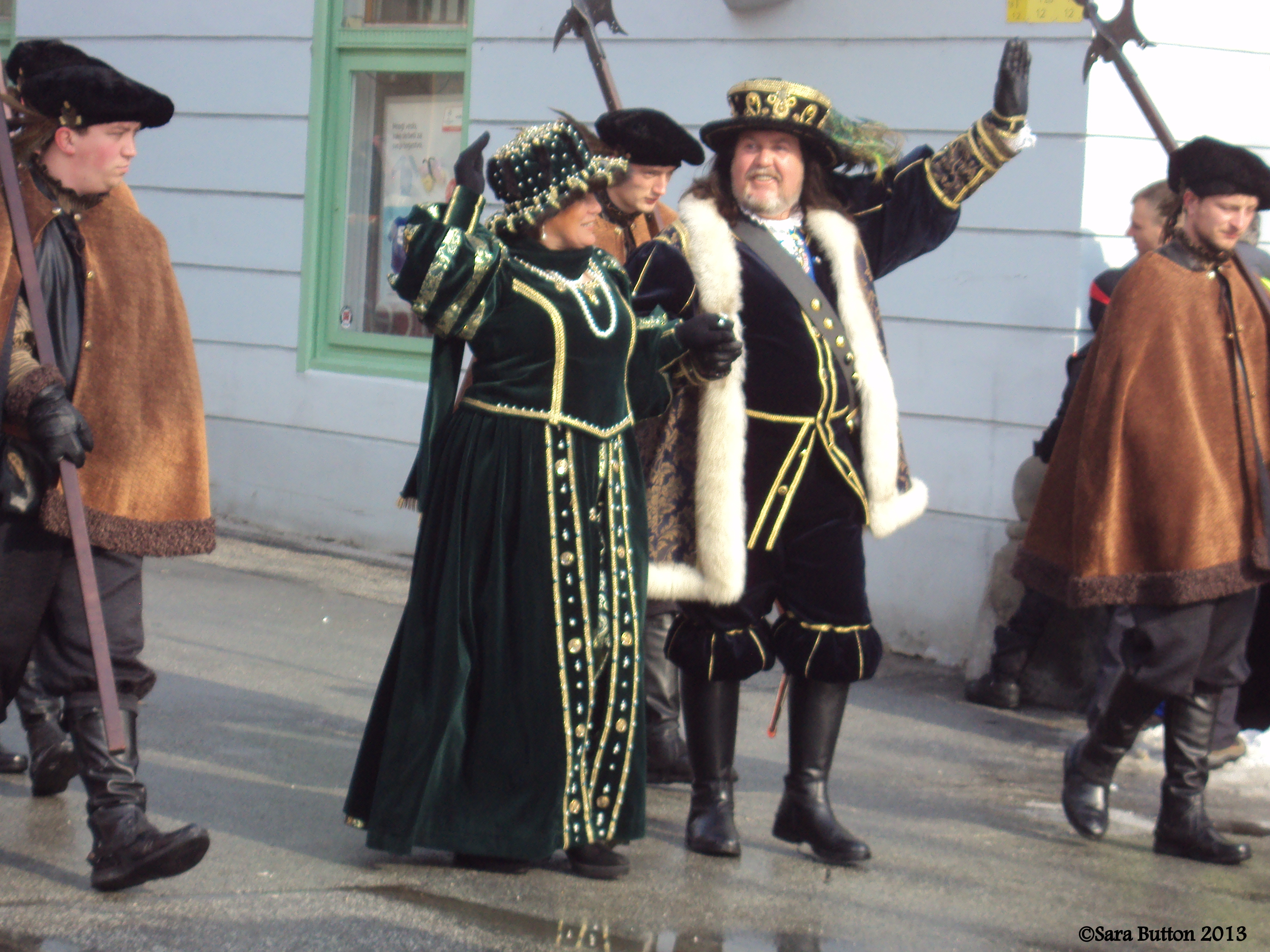 Spearmen: no face mask, these men are responsible for keeping the atmosphere light and merry; their name is from their accessory: a spear, which they toss into the air like a baton. The ultimate disgrace for a spearman is to drop his spear!